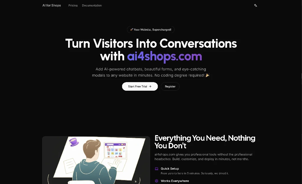 Welcome to ai4shops.com! This comprehensive guide will walk you through creating your account and setting up your first project. Whether you want to add an AI chatbot, create beautiful modals, or build forms for your website, it all starts here.